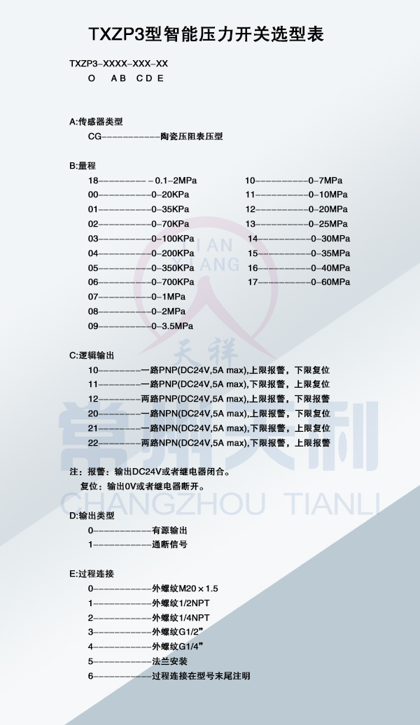 TXZP3智能壓力開關(guān)基本參數(shù)