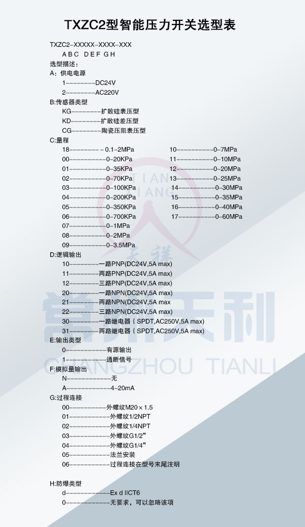今天接著給客戶介紹下常州天利產(chǎn)品TXZC系列智能壓力開關中的同型號的另一款產(chǎn)品,概述,參數(shù),選型如下。